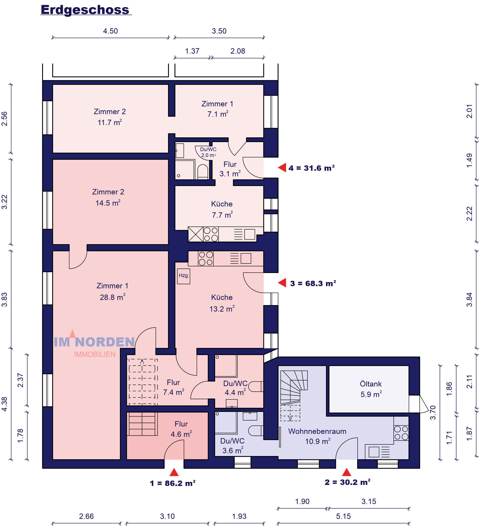 •Wohnnebenfläche: ca. 80,3 m² (Wohnung Nr. 2 mit ca. 30,2 m² und Teile der Wohnung Nr. 1 mit ca. 50,1 m²)