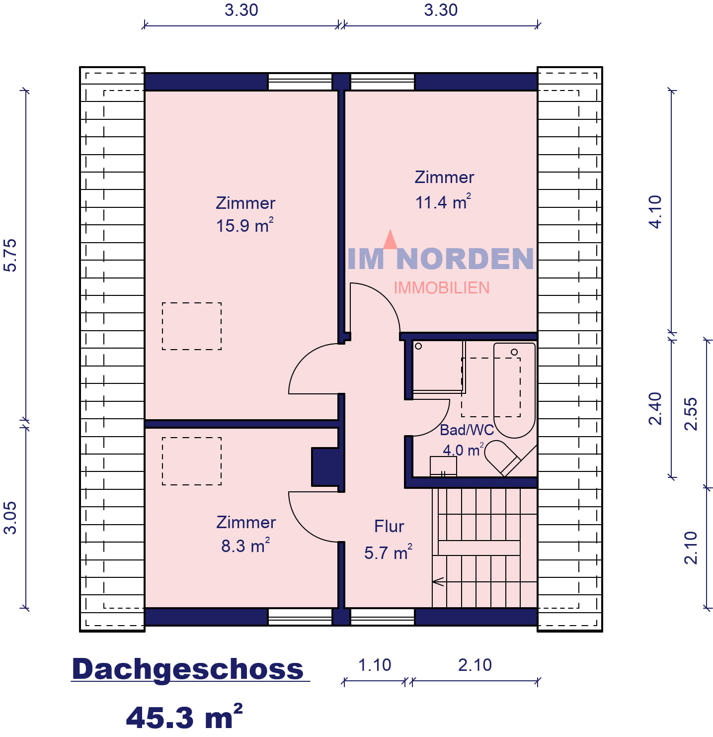 Wieder zurück zum Windfang erreichen Sie über eine Holztreppe das Dachgeschoss. Ein Flur erschließt alle drei Zimmer und das Bad.