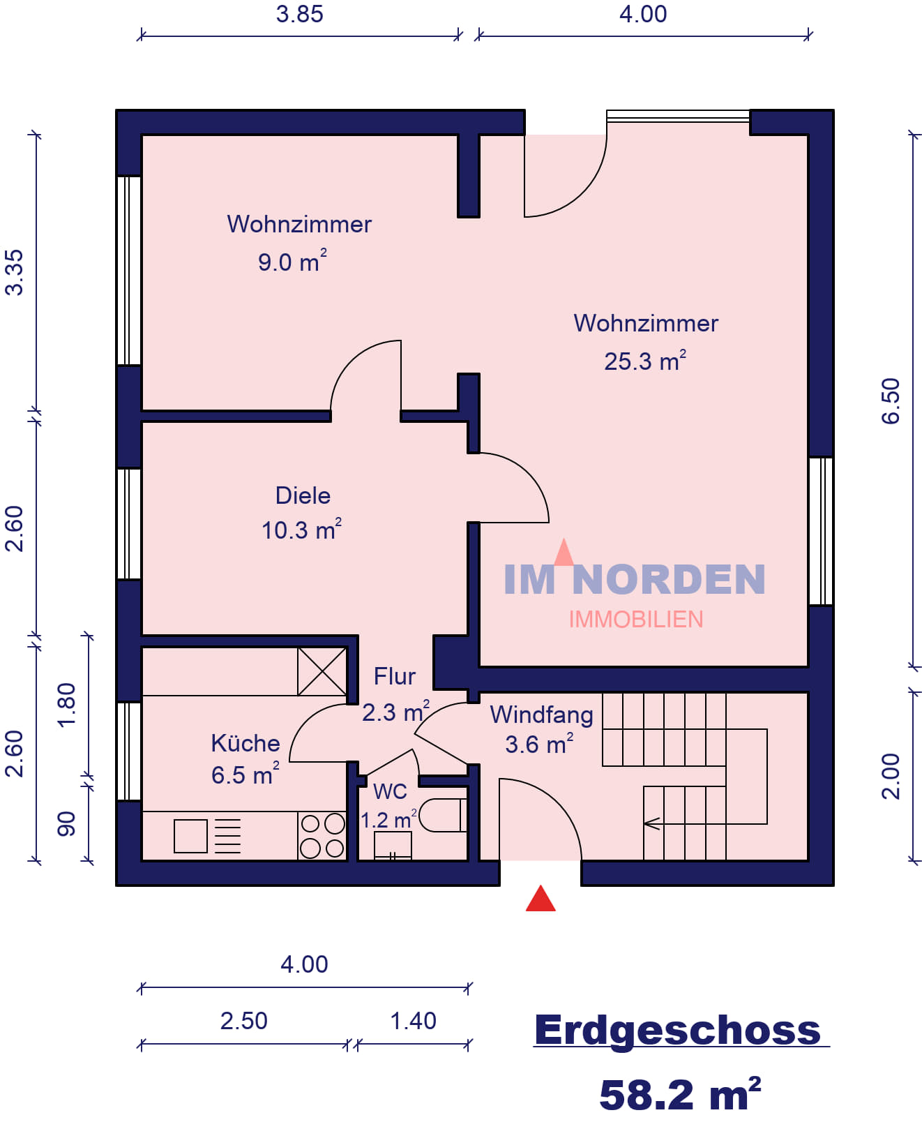 Beim Betreten des Hauses gelangen Sie in einen Windfang, von dem die Treppen ins Dachgeschoss und in den Vollkeller abgehen.