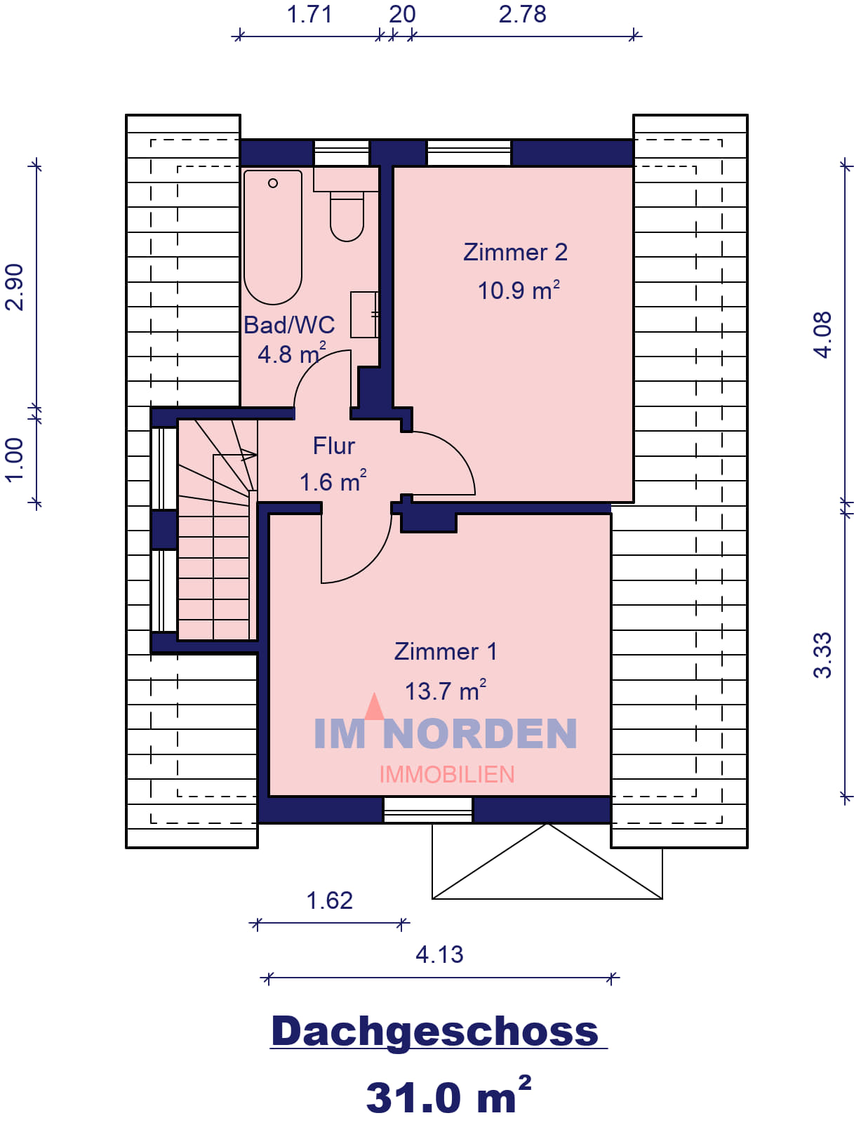 Eine Holztreppe führt in das Obergeschoss, in dem zwei Schlafräume sowie ein Wannenbad zur Verfügung stehen.